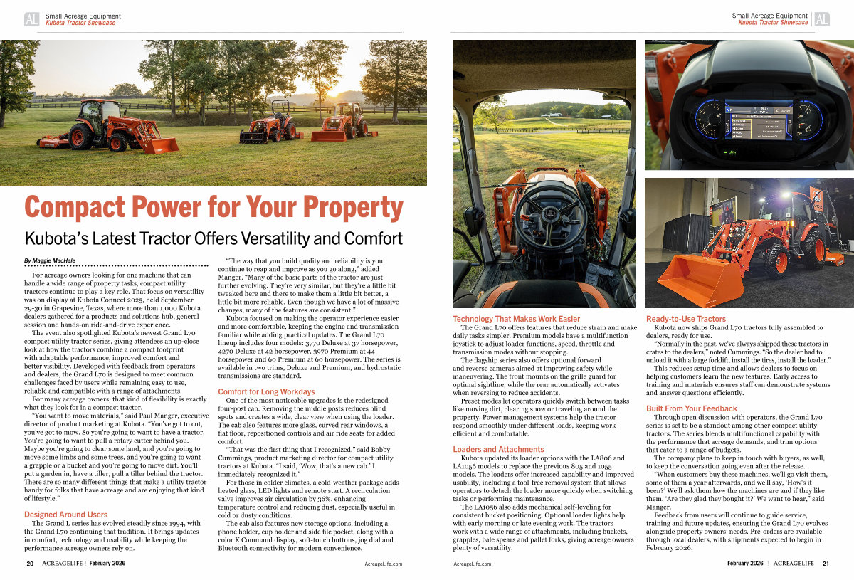 For acreage owners looking for one machine that can handle a wide range of property tasks, compact utility tractors continue to play a key role. That focus on versatility was on display at Kubota Connect 2025, held September 29-30 in Grapevine, Texas, where more than 1,000 Kubota dealers gathered for a products and solutions hub, general session and hands-on ride-and-drive experience.