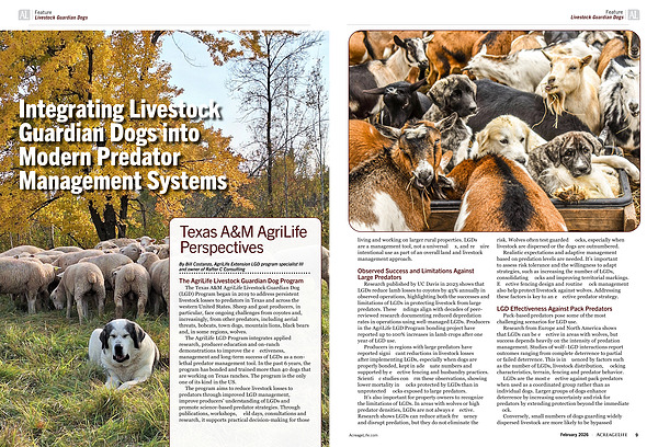 Research published by UC Davis in 2023 shows that LGDs reduce lamb losses to coyotes by 43 % annually in observed operations, highlighting both the successes and limitations of LGDs in protecting livestock from large predators. These findings align with decades of peerreviewed research documenting reduced depredation rates in operations using well-managed LGDs. Producers in the AgriLife LGD Program bonding project have reported up to 100 % increases in lamb crops after one year of LGD use.