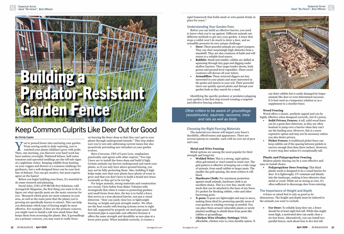 David Joles, COO of PURCOR Pest Solutions, told AcreageLife Magazine, the first thing you want to do is figure out what specific pests are the main concerns for you.“ Research which pests are most common in your area, as well as the main pests that the plants you’ re growing are specifically known to attract. This can help you determine which type of fencing might be most effective. For example, if deer are the primary concern, you might want to install a tall wire-mesh fence that keeps them from accessing the plants. But, if groundhogs are a primary concern, you may want to really focus on burying the fence deep so that they can’ t get to your plants through underground tunnels.” This step makes sure you’ re not only addressing current issues but also proactively preventing new intruders as your garden evolves.