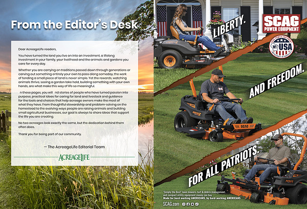 In these pages, you will find stories of people who have turned passion into purpose, practical ideas for caring for land and livestock and guidance for the tools and choices that help acreage owners make the most of what they have. From thoughtful stewardship and problem-solving on the homestead to the evolving ways people are raising animals and building small agricultural businesses, our goal is always to share ideas that support the life you are creating.