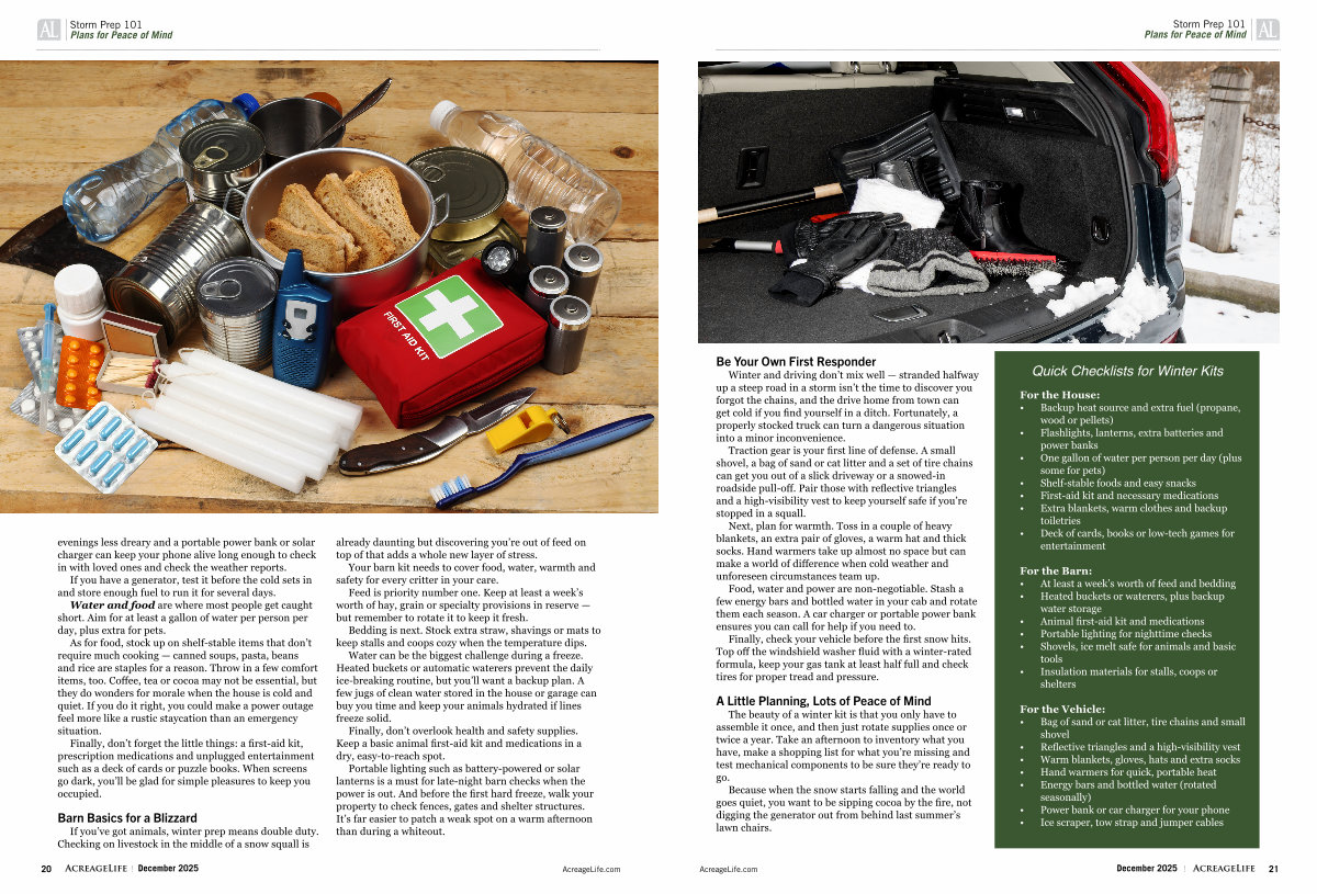 Portable lighting such as battery-powered or solar lanterns is a must for late-night barn checks when the power is out. And before the first hard freeze, walk your property to check fences, gates and shelter structures. It’ s far easier to patch a weak spot on a warm afternoon than during a whiteout.