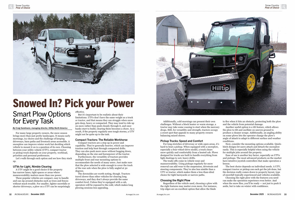 For many large property owners, the snow season brings more than just pretty landscapes. It means early mornings, icy chores and the challenge of keeping driveways, barn paths and livestock areas accessible. A snowplow can improve winter work but deciding which vehicle to mount it on is a question of its own. Choosing between your utility vehicle( UTV), compact tractor or pickup truck depends on your property, workload, priorities and personal preferences.