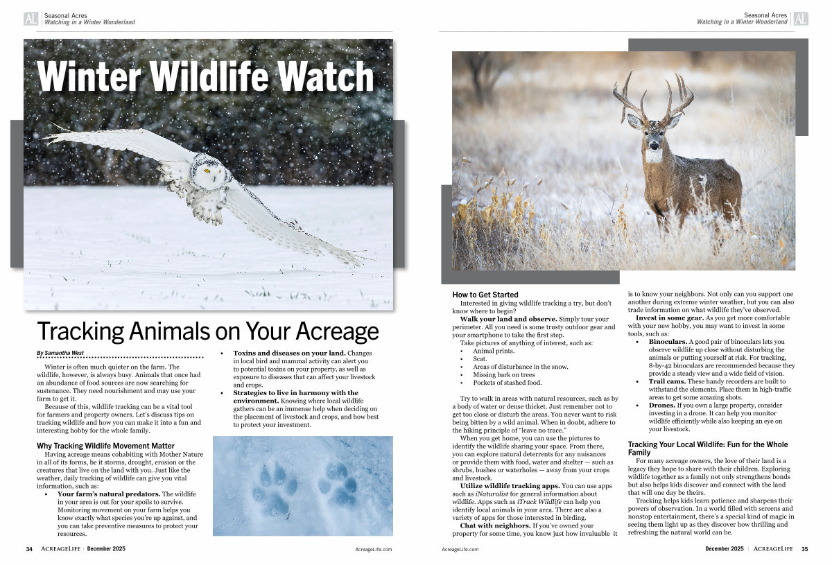 Having acreage means cohabiting with Mother Nature in all of its forms, be it storms, drought, erosion or the creatures that live on the land with you. Just like the weather, daily tracking of wildlife can give you vital information, such as: