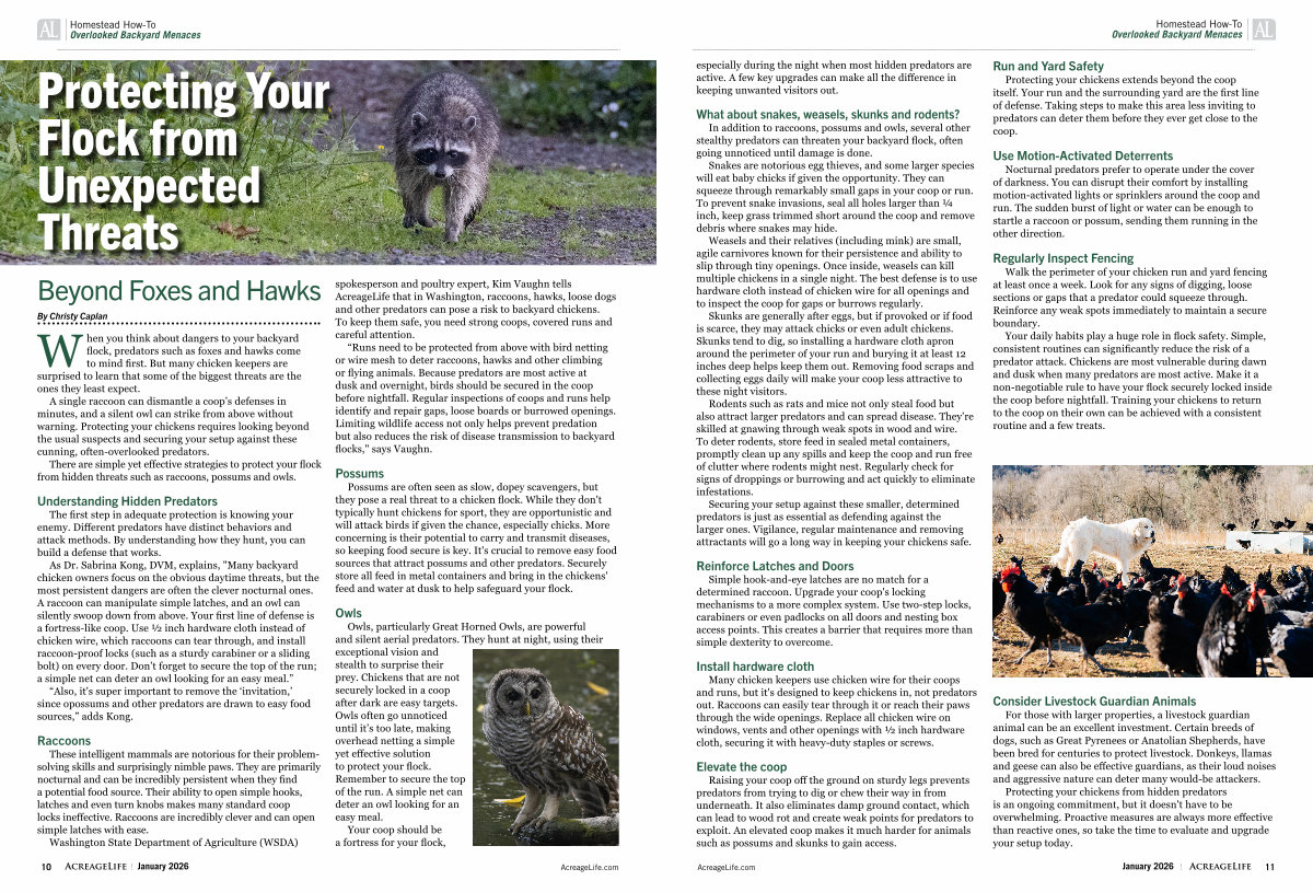 In addition to raccoons, possums and owls, several other stealthy predators can threaten your backyard flock, often going unnoticed until damage is done.