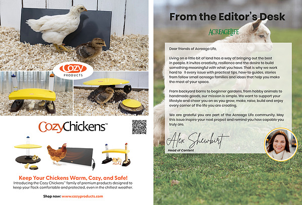 Living on a little bit of land has a way of bringing out the best in people. It invites creativity, resilience and the desire to build something meaningful with what you have. That is why we work hard to fill every issue with practical tips, how-to guides, stories from fellow small acreage families and ideas that help you make the most of your space.
