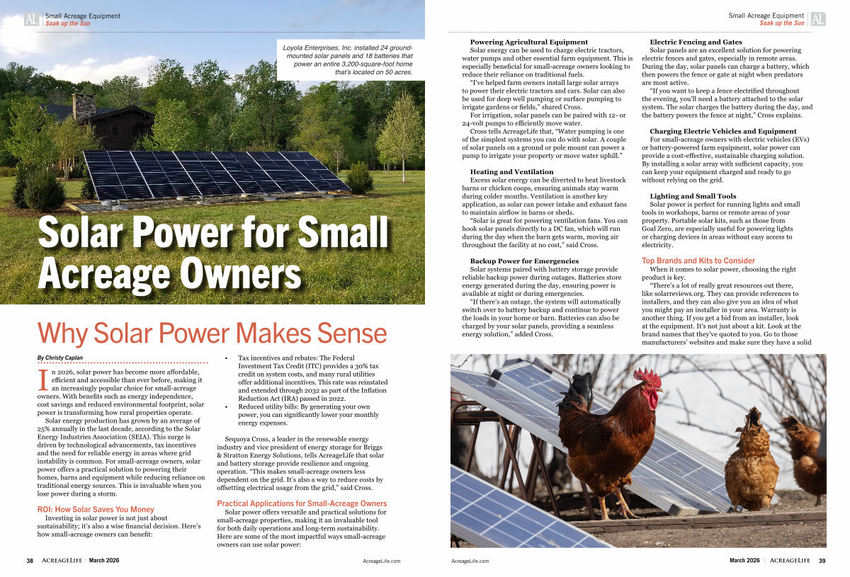 Cross tells AcreageLife that,“ Water pumping is one of the simplest systems you can do with solar. A couple of solar panels on a ground or pole mount can power a pump to irrigate your property or move water uphill.”