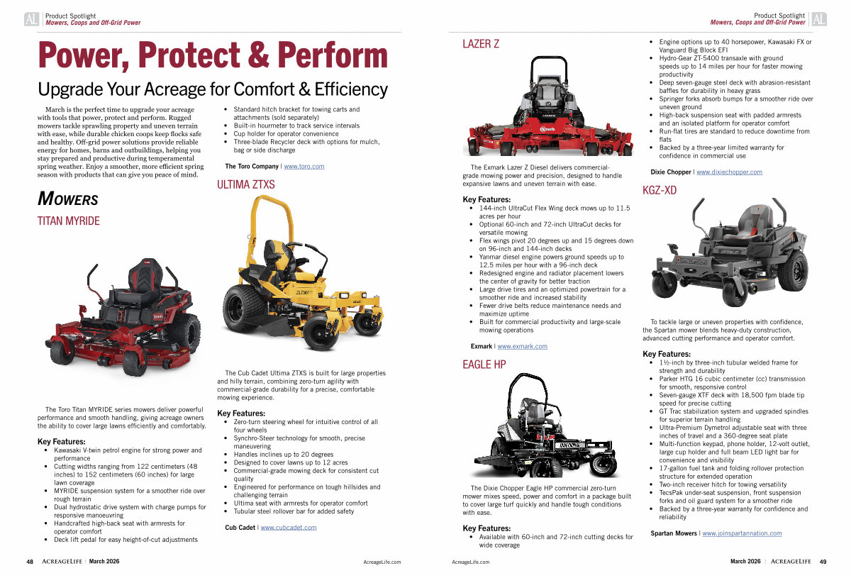 March is the perfect time to upgrade your acreage with tools that power, protect and perform. Rugged mowers tackle sprawling property and uneven terrain with ease, while durable chicken coops keep flocks safe and healthy. Off-grid power solutions provide reliable energy for homes, barns and outbuildings, helping you stay prepared and productive during temperamental spring weather. Enjoy a smoother, more efficient spring season with products that can give you peace of mind.