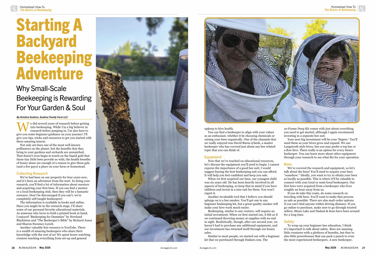 We’ ve had bees on our property for four years now, and it’ s been an adventure from the start. In doing your research, you’ ll find a lot of information about mentors and acquiring your first bees. If you can find a mentor or a local beekeeping club, then they will be a fantastic resource. Don’ t be discouraged if you can’ t; we ' re completely self-taught beekeepers!