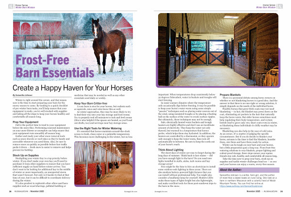 Winter can be tough on your barn and your horses, but a little preparation goes a long way. From frost-free watering solutions to cozy blankets, proper lighting and rodent-proof storage, these steps ensure your equine friends stay safe, healthy and comfortable all season long. Take the time now to prep your barn, stock up on supplies and tackle winter challenges head-on— so you and your horses can enjoy a warm, worry-free season.