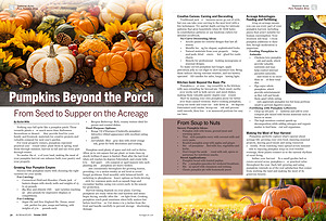 Pumpkins perfectly capture what ' s special about acreage life: growing your own food, enjoying seasonal projects, sharing good meals and using resources efficiently. From watching vines spread across summer fields to enjoying pumpkin soup on cool October evenings, these plants connect us to the natural rhythms of rural living.
